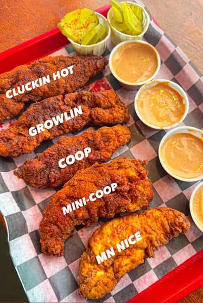 This place only has strips and a sammich. I always get the sammich. The spice level can go very high actually. I think most people will be good with the MN nice to Mini-Coop. I think the Coop level has been my favorite level of spice to flavor level. Its great fried chicken served with fries and coleslaw.